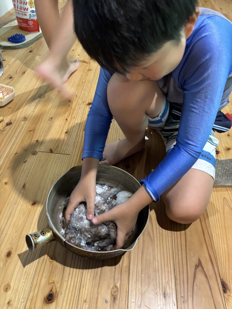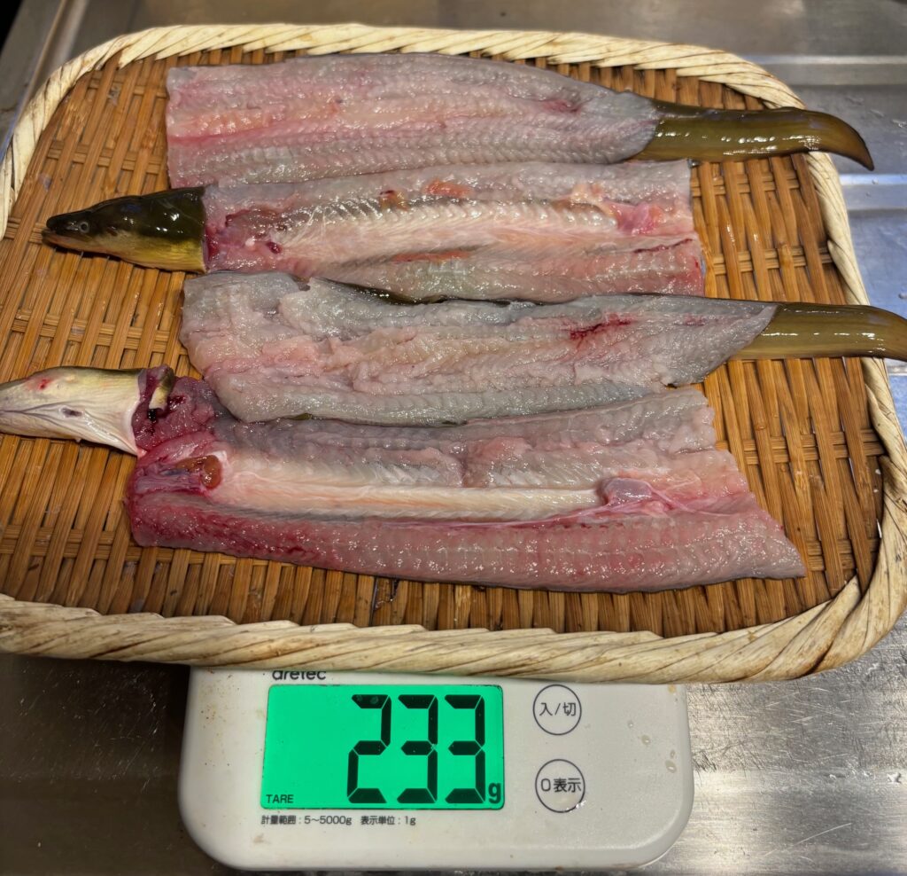 私が投網で5匹、子供は潜って手長海老獲り用の網で4匹、下から3番目の23㌢も子供が獲りました